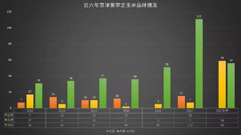 從上圖可以看出北京的品種審定數量沒有明顯的變化,而河北的省審的數量竟然達到 111 個,遠遠大于往年的數量,而她往年的玉米種植面積在 4000 萬畝左右。