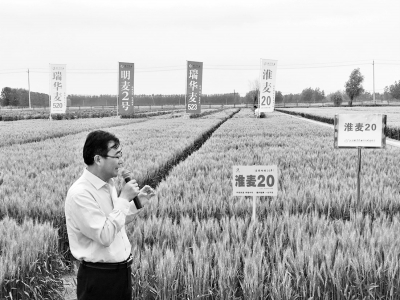 圖為夏中華在“淮麥20”示范田中講解品種特性和種植技術。尹忠俏攝