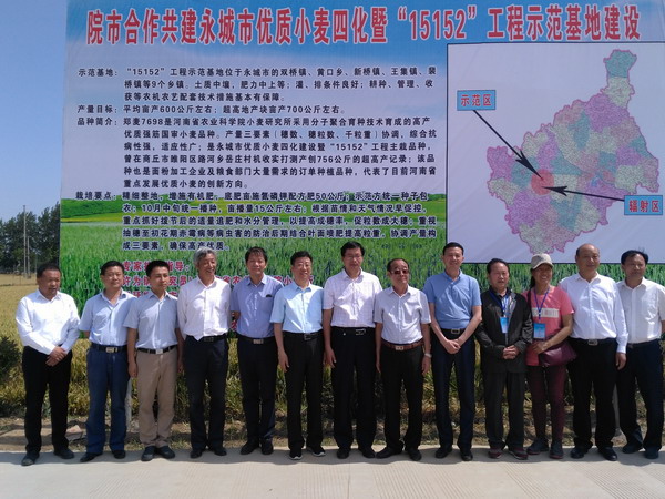 永城市是河南省加快“四優、四化”發展中確定的發展優質專用小麥8個試點縣(市)之一,在永城創建優質強筋小麥示范區也是我院“現代農業科技示范精品工程”確定的重點任務。5月25日,河南省農科院與永城市政府聯合召開高產優質強筋小麥新品種“鄭麥7698”生產示范觀摩會,我院副院長喬鵬程,永城市委常委、宣傳部長畢江遠,永城市政府副市長梁廷振、孫虎出席會議。