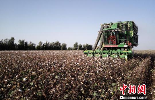 資料圖:圖為當地棉花成熟時當地民眾用大型機械采摘棉花。 詹春喜 攝