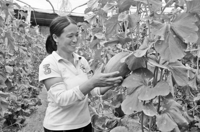 富農果蔬扶貧基地內,工人喜摘“西周蜜”哈密瓜。
