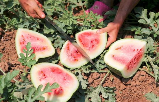 6月29日下午,記者來到趙師傅的瓜田,他的兒子隨便在瓜田里切開幾個西瓜,果然瓜皮較厚并且瓜瓤有些發白。趙師傅說,這樣的西瓜即便拉到市場上也沒有人買。