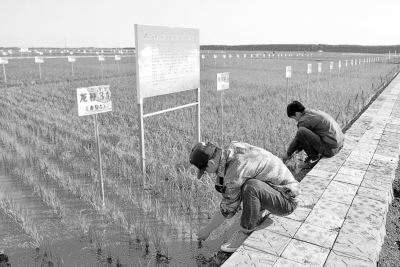 高產栽培技術研究,對龍粳31、龍粳46、墾稻31等優質水稻品種進行肥效、抗病、產量等方面的試驗,為農業生產實現高產高效奠定了基礎。圖為技術人員在查看試驗水稻生長情況。
