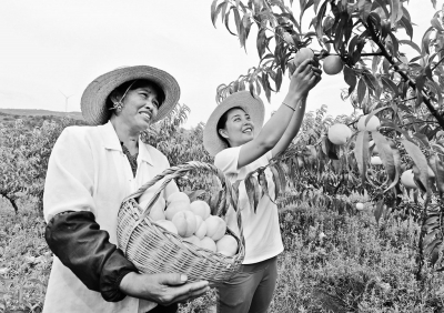 7月6日,安徽省馬鞍山市連片種植的良種黃桃“黃金一號”俏滿枝頭。近年來,馬鞍山市大力發展黃桃種植業,代表性新品種“黃金一號”肉質肥厚細嫩、口感甘甜多汁,深受消費者歡迎。目前“黃金一號”的平均畝產已經達到1300公斤,畝效益2萬多元。據了解,馬鞍山市為優質黃桃注冊了“仙蹤綠營”商標,并引進江浙滬地區的優質食品加工企業,還吸引了大量游人前來采摘品嘗。圖為果農正在采摘“黃金一號”黃桃。 張玲歐宗濤攝