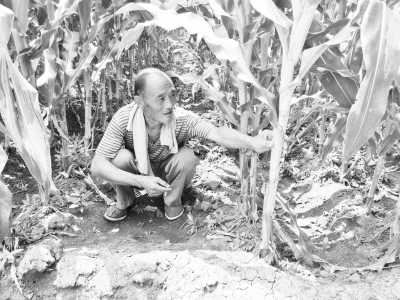農民李士山在向記者展示他的玉米蕓豆套種田。