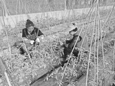 圖為臨潼區照渠村村民在家門口的番茄制種園區內進行番茄授粉工作。劉盼攝
