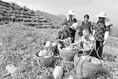 ,日收量達1000多公斤。今年5月中旬,吳建平在10多畝山地種植了8424、西龍8號等耐干旱,易管理,品質優的山地西瓜品種,每畝可增收5000元左右。寧文武攝