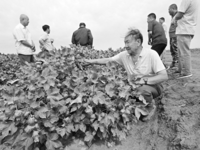 國欣種業選育的棉種已經覆蓋長江、黃河流域主產棉區。近幾年重點向新疆棉區發力,現已投資2億多元,在北疆、南疆建有繁棉種農場4萬畝。輪臺縣的棉種加工廠日產包衣棉種140噸。近日,國欣農村技術服務總會董事長盧國欣帶領專家、顧問團隊,對11個棉花育種基地進行了考察,一般每畝平均結有成桃8萬個左右,預計畝產籽棉400公斤左右,其中塔河、庫車農場管理較好的約3000畝棉田,每畝平均成桃近10萬個,預計畝產籽棉500公斤,高于內地籽棉產量1倍以上。圖為育種家張德才在考察棉花新品系10—6B。 余宏章攝