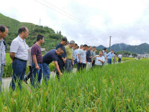與會人員分乘兩輛大巴,首先到村頭鎮朝塢垅畈縣級水稻新品種示范片,現場考察了甬優1540高產示范現場;然后在音坑鄉察畈省級水稻新品種擴展鑒定與豐產示范基地,現場觀摩了華浙優1號、華中優1號兩個示范品種及甬優7850、浙優21、中嘉優6號等15個展示品種。大家沿著參觀路線一路走,一路看,一邊認真聽取項目承擔單位負責人現場講解,詳細了解各品種的適應性、抗性;一邊仔細察看,從各個品種的植株結構、長勢長相、結實情況、抗病力等綜合表現認真進行比較,從中選擇出適合開化縣綜合性狀況優良的新品種進行全面推廣。