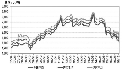 主產區、主銷區及全國平均價格變化(2007-2016)
