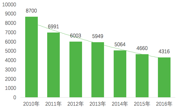 截至2016年底,持有效生產經營許可證的企業數量4316家,較2010年的8700家減少了4384家,減幅過半。
