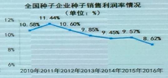 企業種子銷售收入與利潤2010年以后經歷了一段高速增長時期,自2013年以后增速趨緩,進入平臺期,尤其是2016年,行業銷售收入和利潤均出現較大幅度下降;同時,企業種子銷售利潤率呈下滑趨勢,已由2011年的11.4%,下滑到2016年的8.6%。