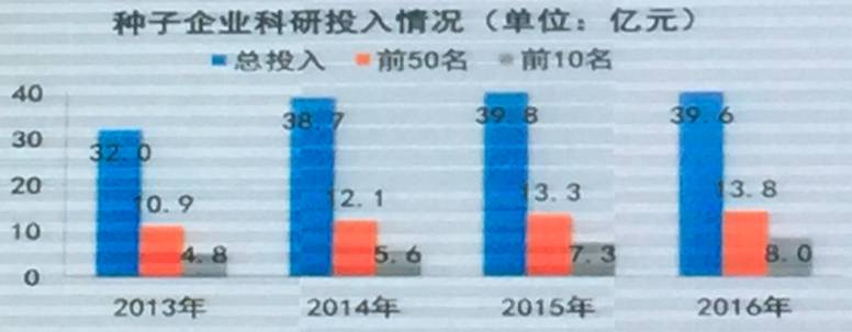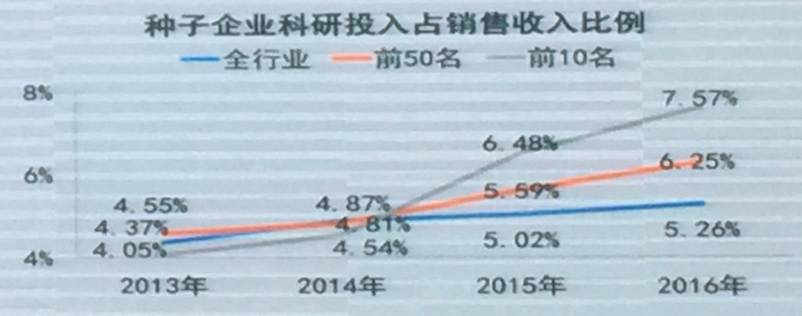 2016年,種子銷售前50強企業科研投入13.8億元,占銷售收入的6.25%,其中前10強科研投入8億元,占銷售收入的7.57%,較行業總體水平高出2.3%,較2013年提高了3.5%;隆平高科、大北農、中種集團、墾豐種業等企業每年科研投入均是億元規模。