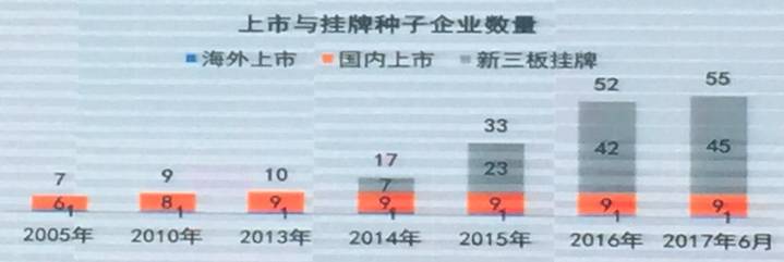 截至2017年6月底,共有55家種子企業上市或在新三板掛牌交易,總市值超千億元。上市、掛牌企業數量上雖只占全國種子企業的1%,但其市場份額卻已達20%。