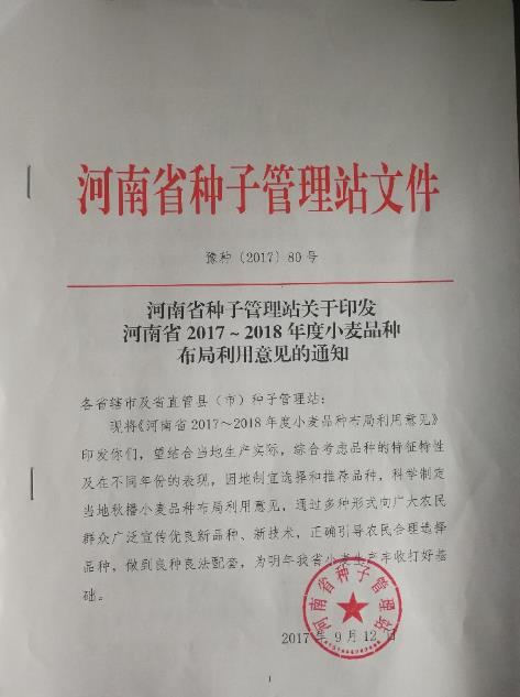 河南省種子管理站關于印發河南省2017年-2018年度小麥品種布局利用意見的通知
