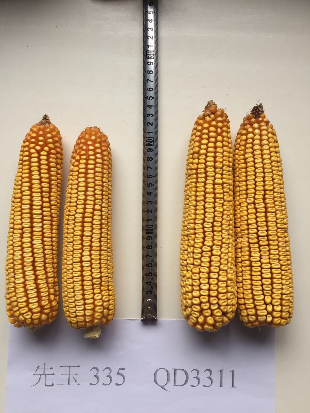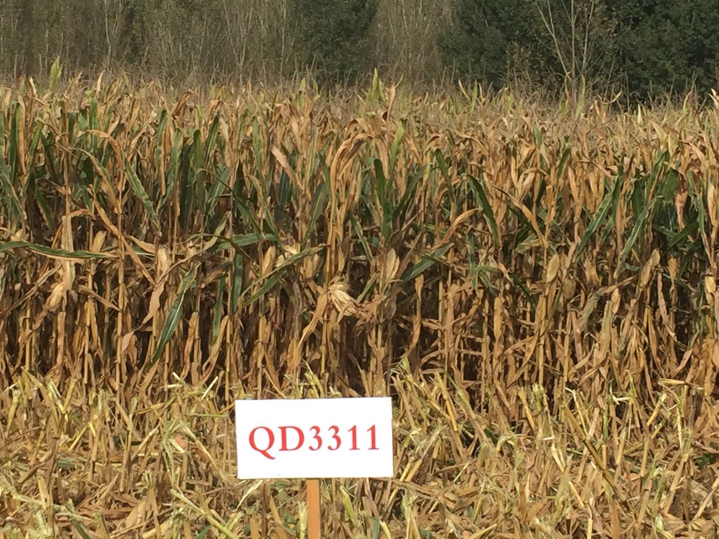 各品種表現:迪卡517的畝密度4400株,倒伏株1%,株高285厘米,穗位124厘米,穗行數19.6,行粒數40,籽粒含水量23.8% ,田間掉穗率0.04%,掉籽率35粒/m2,收獲的籽粒破碎率6.8%,收獲單產725公斤;迪卡159的畝密度4400株,倒伏株0.5%,株高290厘米,穗位130厘米,穗行數18.4,行粒數42,籽粒含水量26.9%,田間掉穗率0.03%,掉籽率28粒/m2,收獲的籽粒破碎率7.8%,收獲單產752公斤;先玉335畝密度4400株,倒伏株6%。株高316厘米,穗位118厘米,穗行數17.4,行粒數40,籽粒含水量25.2% ,田間掉穗率0.2%,掉籽率20粒/m2,收獲的籽粒破碎率5.0%,收獲單產760公斤;今年在該區相鄰地塊種植了QD3311玉米新品種30畝,現在的畝密度是3800株,倒伏株0.5%,株高300厘米,穗位126厘米,穗行數18.2,行粒數44,籽粒含水量25.8%,田間掉穗率0.05%,掉籽率25粒/m2,收獲的籽粒破碎率3.6%,收獲單產788公斤。