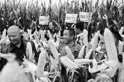 圖為近日,150多名農牧民在敖漢旗新惠鎮康家店村500畝偉科702糧飼兼用玉米田觀看品種長勢。 張國鋒攝