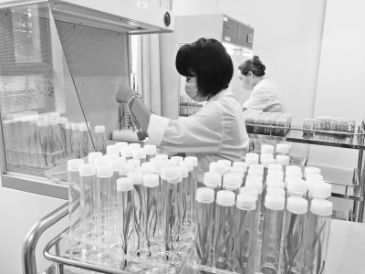 科研人員在進行組培苗叢芽分株和生根壯苗操作。