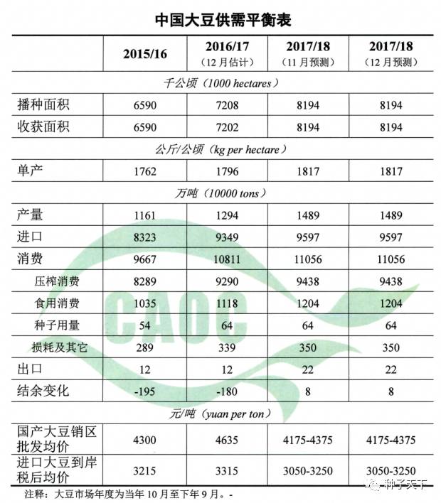 本月預測,2017/18年度,中國大豆播種面積8194千公頃,比上年度增加986千公頃,增幅13.8%;大豆單產每公頃1817公斤,比上年度增加1.2%;大豆總產量1489萬噸,比上年度增加195萬噸,增幅15.1%;大豆進口量9597萬噸,比上年度增加248萬噸,增幅2.7%;大豆總消費量1.11億噸,比上年度增加245萬噸,增幅2.3%。本月大豆市場供需形勢與上月預測數保持一致。