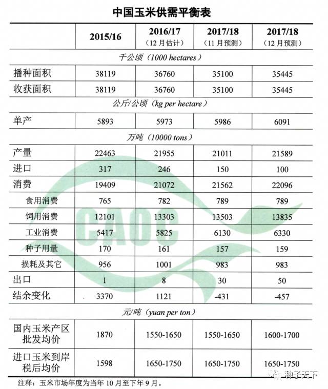 本月預測,2017/18年度,根據國家統計局數據,中國玉米播種面積35445千公頃,比去年減少1315千公頃。玉米單產每公頃6091公斤,比去年每公頃增加118公斤。玉米產量為2.16億噸,比去年調減366萬噸。