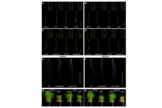 干旱、高鹽等環境脅迫顯著抑制水稻的正常生長并導致減產,水稻缺鉀會引起植株矮縮、莖稈細弱,嚴重的產生近似火燒狀的“鐵銹稻”等,水稻缺鉀還會進一步降低其對逆境脅迫的耐受性。研究發現OsHAK1(超表達轉基因材料)在根系和地上部均受干旱、高鹽誘導上調表達;oshak1突變體在營養和生殖生長期均表現對干旱、鹽脅迫敏感,而過量表達OsHAK1可以促進活性氧的清除、增強脅迫響應相關基因的表達、提高水稻的抗旱、耐鹽性;OsHAK1的表達量與秈稻和粳稻品種間耐鹽性的差異成正相關;通過干旱誘導啟動子(OsHAK1pro)特異啟動根發育相關基因OsRAA1的表達,獲得在干旱逆境下根系生長、鉀積累、單株產量和抗旱性均顯著提高的轉基因水稻。研究結果可為培育抗旱、耐鹽水稻新品種提供理論基礎。