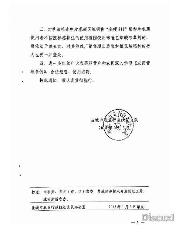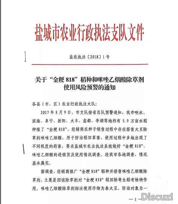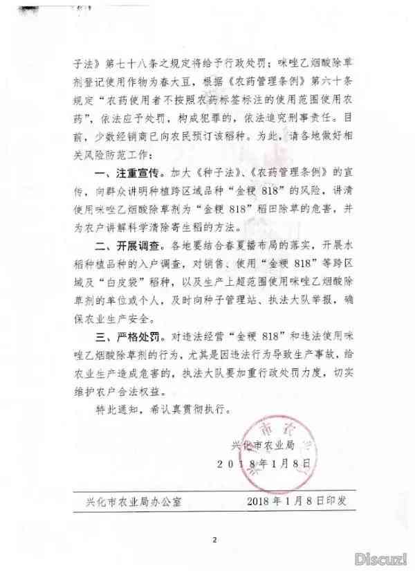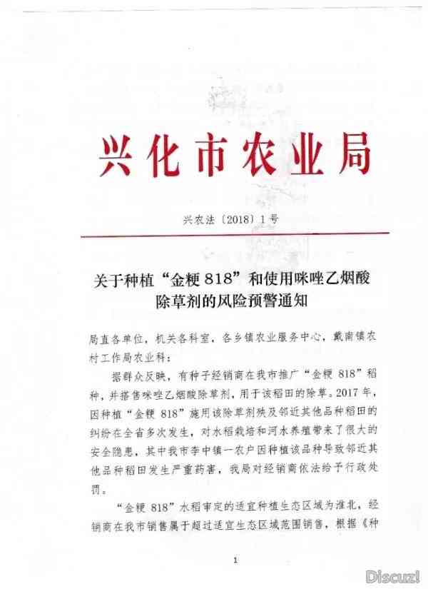 特別要強調是,“金粳818”水稻審定的適宜種植生態區域為淮北,經銷商在我市經銷該品種屬個體行為,并超過該品種的適宜生態種植區域范圍,既不符合農業部門的主推品種要求,更與市委、市政府培育興化大米品牌的決策部署不相符,對違法經營“金粳818”和違法使用咪唑乙煙酸除草劑的行為,我局將加大打擊力度,加重行政處罰,切實維護農戶合法權益。該品種是由周邊鹽城地區傳入我市,鹽城市農業行政執法支隊及我局均分別于元月3日、元月8日,下發了種植該稻種的風險提示的緊急通知,希望廣大網友及農戶要相信科學,不信謠、不傳謠,并及時舉報該違法經營行為,共同維護興化良好的市場秩序。