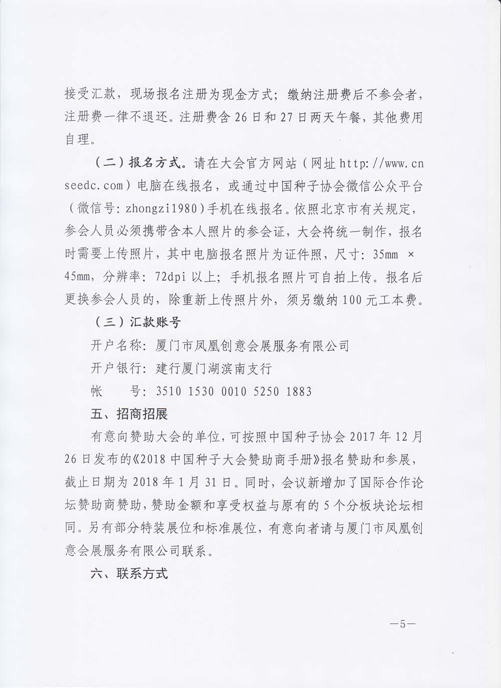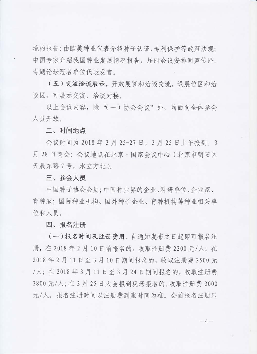 (二)報名方式。請在大會官方網站(網址//www.cnseedc.com)電腦在線報名,或通過中國種子協會微信公眾平臺(微信號:zhongzi1980)手機在線報名。依照北京市有關規定,參會人員必須攜帶含本人照片的參會證,大會將統一制作,報名時需要上傳照片,其中電腦報名照片為證件照,尺寸:35mm × 45mm,分辨率:72dpi以上;手機報名照片可自拍上傳。報名后更換參會人員的,除重新上傳照片外,須另繳納100元工本費。