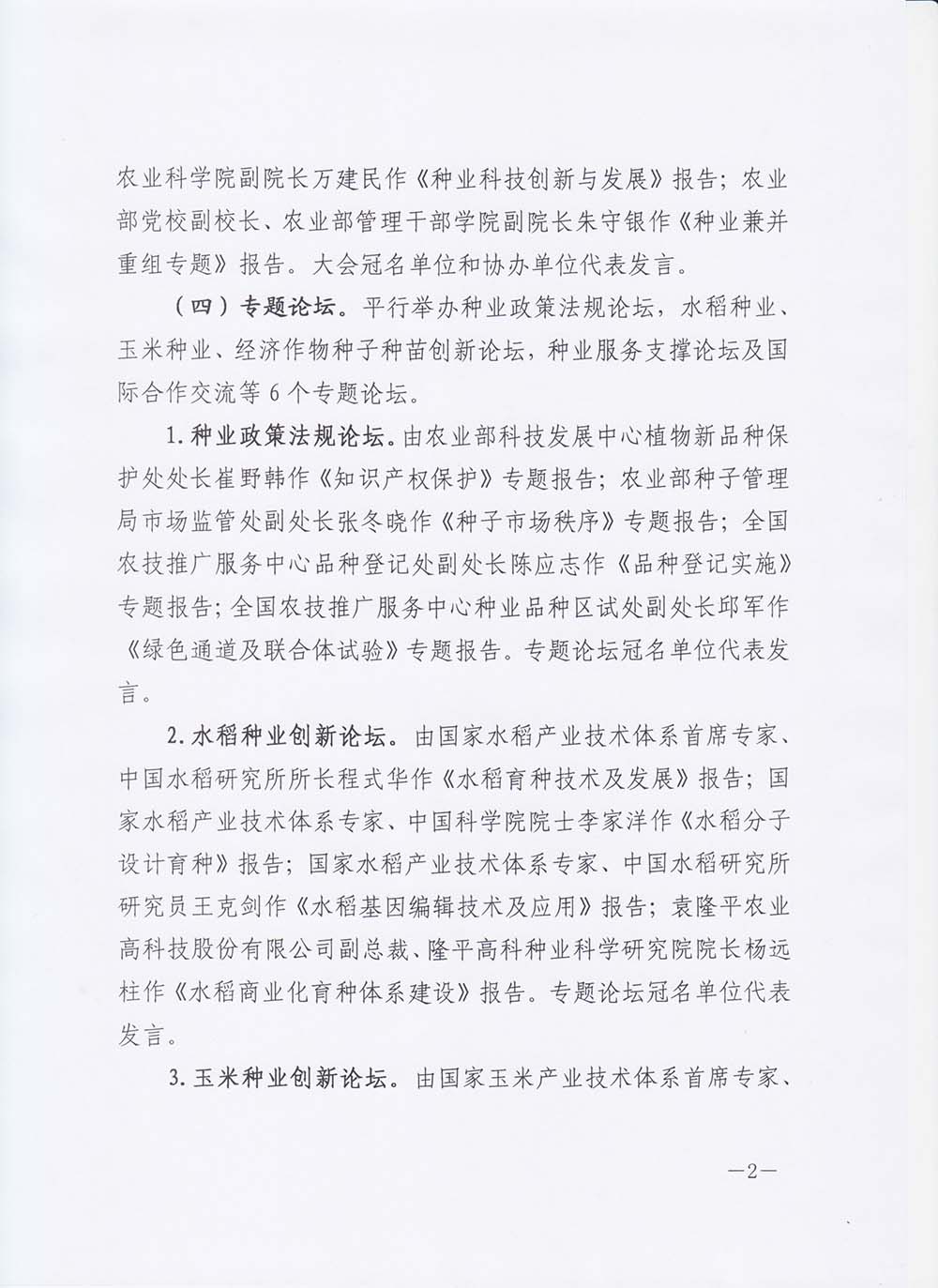 (四)專題論壇。平行舉辦種業政策法規論壇,水稻種業、玉米種業、經濟作物種子種苗創新論壇,種業服務支撐論壇及國際合作交流等6個專題論壇。
