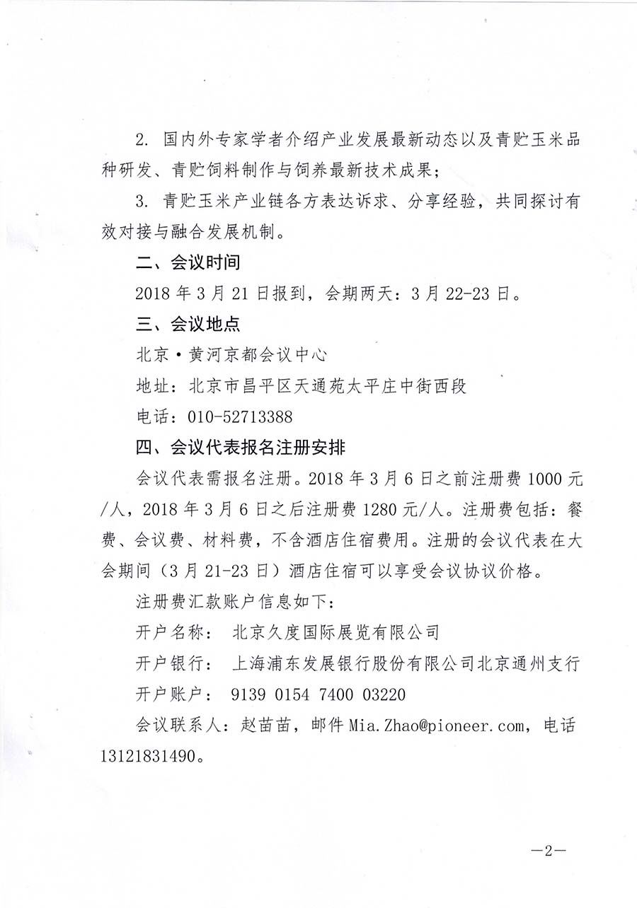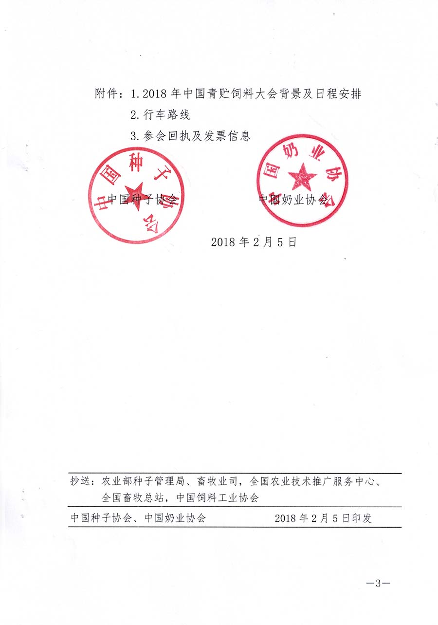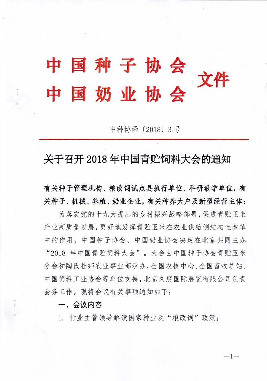 為落實黨的十九大提出的鄉村振興戰略部署,促進青貯玉米產業高質量發展,更好地發揮青貯玉米在農業供給側結構性改革中的作用,中國種子協會、中國奶業協會決定在北京共同主辦“2018年中國青貯飼料大會”。大會由中國種子協會青貯玉米分會和陶氏杜邦農業事業部承辦,全國農技中心、全國畜牧總站、中國飼料工業協會等單位支持,北京久度國際展覽有限公司負責會務工作。現將會議有關事項通知如下: