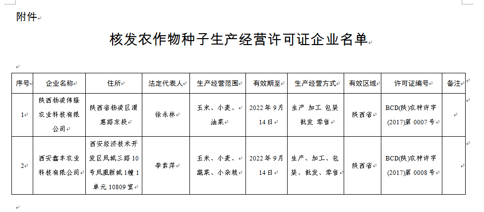 根據《中華人民共和國種子法》《農作物種子生產經營許可管理辦法》及《植物新品種保護條例》有關規定,經審核,同意為陜西楊凌偉隆農業科技有限公司、西安鑫豐農業科技有限公司2家企業核發《農作物種子生產經營許可證》(詳見附件)。