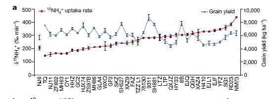 在論文中,研究團隊選取了36個秈稻品種。充足的氮肥條件下水培4周測各品種對氮的吸收,同樣在高肥條件下土壤種植各品種來采集產量數據。結果顯示,36個品種對氮的吸收效率存在最大為3倍的差異。