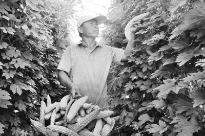 8月28日,新疆生產建設兵團第八師一四三團十八連綠風果蔬專業合作社理事長張本路在設施大棚忙著為客戶采摘苦瓜。張本路今年引種的英國苦瓜品種不僅豐產,而且口感好,加上采用綠色種植新技術,苦瓜一上市就受到廣大消費者的歡迎。目前,苦瓜畝收入已超過一萬多元。 王仁斯攝