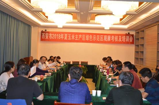 觀摩結束后,召開了西安市2018年夏玉米主產區綠色示范區觀摩考核及培訓會,會議由市農技中心副主任張選厚主持。首先高級農藝師王宏玲對今年全市玉米綠色示范區建設進行了點評,市農技中心科管科于艷梅科長宣讀了此次考核的名次,周至縣南大坪示范園獲得了先進示范園稱號。隨后市農技站楊美悅站長通報了今年全市夏玉米綠色高質高效示范點的實施情況。最后張選厚主任進行了總結講話,他指出:一是要堅定搞好糧食綠色高質高效示范區建設的信心;二是多想辦法,相互交流做好項目,要充分發揮專業合作社的集約生產經營作用;三是要從“一控兩減”、把好播種關、防治好赤霉病等方面入手,切實做好綠色高質高效技術應用。