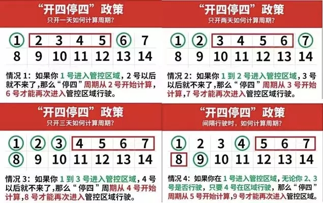 根據“開四停四”政策,外地牌來廣州“連續行駛時間最長不得超過4天,再次駛入須間隔4天以上”。如下圖所示,一共四種情況。表格中,綠色表示可以行駛的天數,紅色表示不能行駛的天數。
