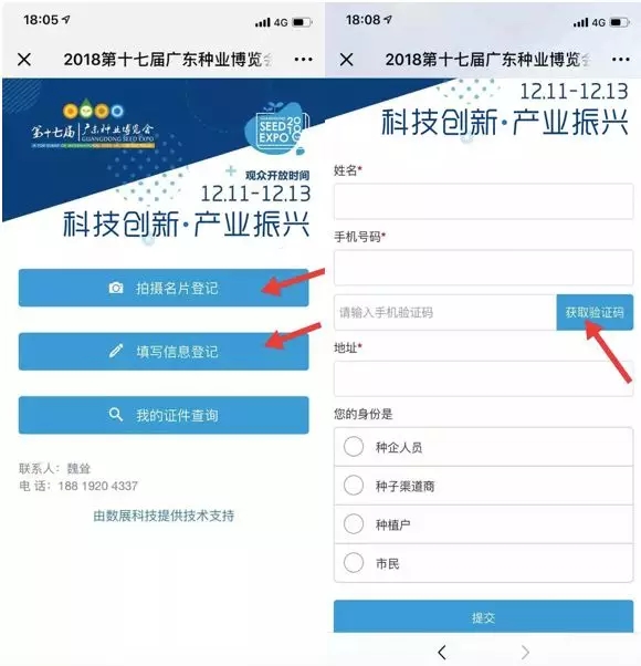 3、點擊“拍攝名片登記”或“填寫信息登記”均可登記,在信息填寫過程中,需要對手機號碼進行驗證。填寫完成后,點擊“提交”。