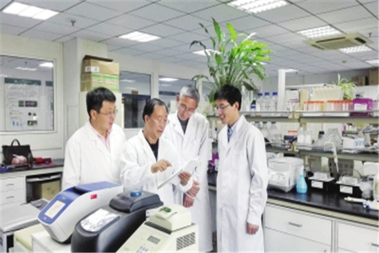 圖為郭三堆(左二)在實驗室指導助手和學生。