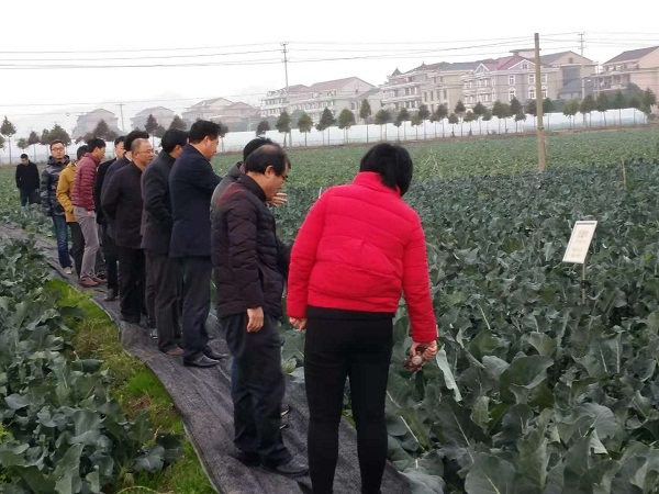 管理站施俊生站長、臺州市農業局黨組成員王國偉和椒江區政府周斌副區長等一行視察我區國家級西蘭花良種重大科研聯合攻關示范展示基地。