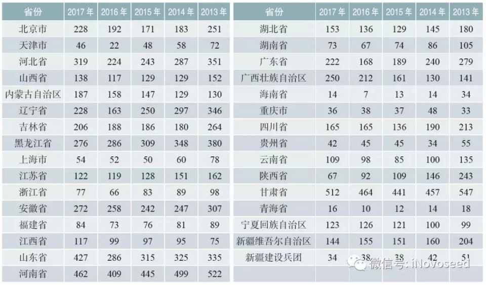 2017 年,有 23 個(ge)省(sheng)(sheng)(區(qu)、市(shi))的(de)種子企(qi)業數(shu)量出(chu)現增長,山(shan)東省(sheng)(sheng)、河北省(sheng)(sheng)、遼(liao)寧省(sheng)(sheng)分別增加(jia) 141 家、95 家和 65 家。有 7 個省(sheng)(sheng)(sheng)(區(qu)、市)的種子企業數(shu)量(liang)減少,數(shu)量(liang)下降較多省(sheng)(sheng)(sheng)份為(wei)陜西省(sheng)(sheng)(sheng)、新(xin)疆維吾爾自(zi)治區(qu)、黑龍江省(sheng)(sheng)(sheng),分別下降 25 家(jia)、11 家、10 家。