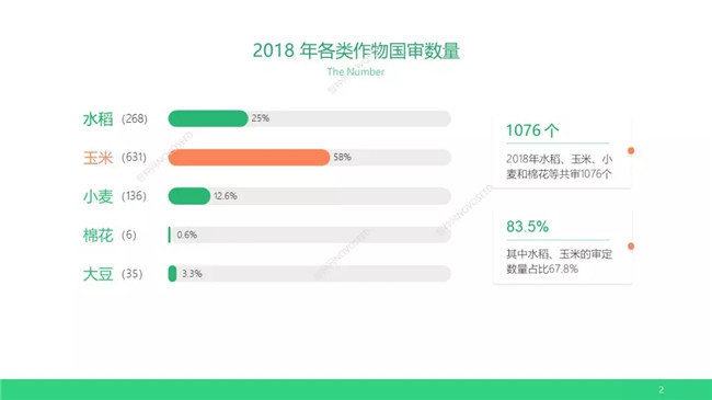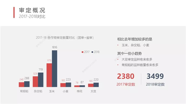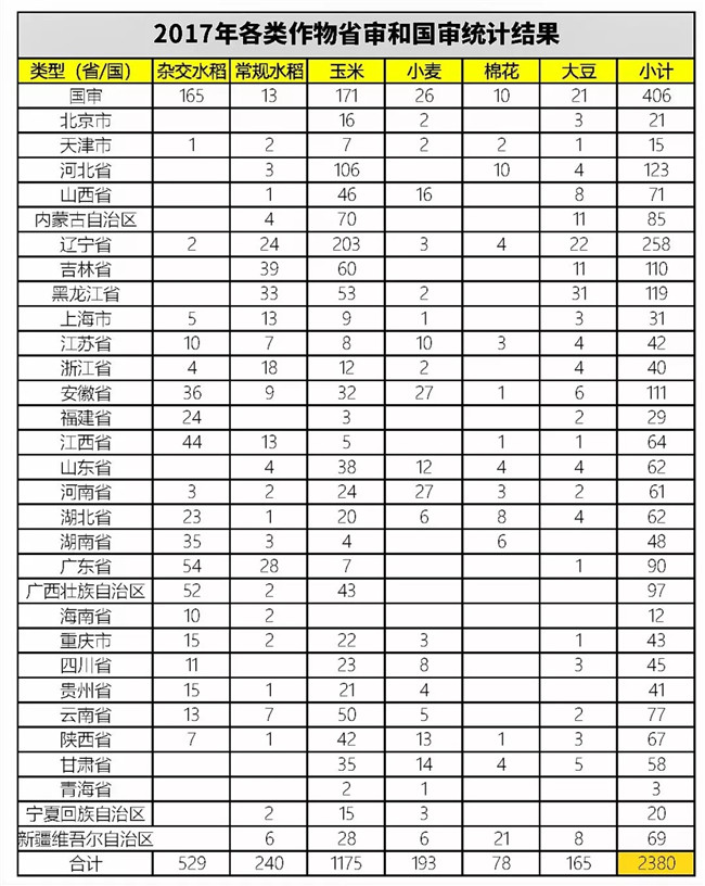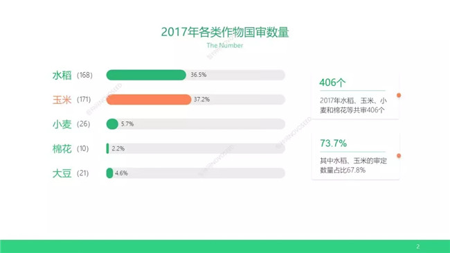2017 年,通過國家審定的主要農作物品種 406 個,與 2016 年相比增加241 個。其中水稻 178 個、玉米 171 個、小麥 26 個、棉花 10 個、大豆 21 個。通過省級審定的主要農作物品種 1974 個,同比增加 600 個。其中水稻 591 個、玉米 1004 個、小麥167 個、棉花 68 個、大豆144 個。2017 年,全國共引種備案主要農作物品種 3 569 個。其中水稻 623 個、玉米2 776 個、小麥91 個、棉花 13 個、大豆 66個。