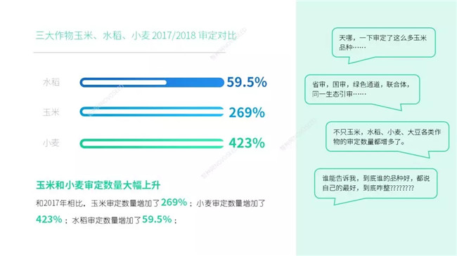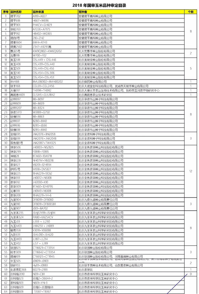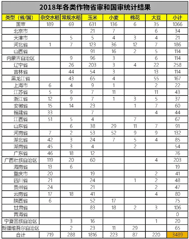 2018 年全國(國審+省審)審定玉米品種 1816 個,是 2017 年審定數量 1175 個的 1.55 倍,是 2016 年 469 個的 3.88 倍。全國審定水稻品種 838 個,是 2017 年審定品種數量 676 個的1.24倍,是 2016 年551個的 1.52 倍。審定小麥品種數量 136 個,是 2017 年審定品種數量75個的 1.36 倍,是 2016 年 84 個的 1.21倍。就玉米品種而言,2018年幾乎是 2016 年的 4 倍,真可謂是“品種海嘯”,僅國審就達631個,超過有品種審定制度以來國審品種總數的1/2!水稻、小麥似乎好一些,但也是有原因的,水稻聯合體試驗比玉米晚一年實施,因為玉米“8+1”聯合試驗提前一年開始;小麥由于是冬季作物,比玉米、水稻推遲一年。所以更大的“品種海嘯”還在后頭。