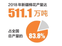 從新疆統計局獲悉:2018年新疆棉花產量再創新高,總產量511.1萬噸,比2017年增長11.9%,總產量占全國的83.8%。新疆棉花總產、單產、種植面積、商品調撥量連續24年位居全國第一。
