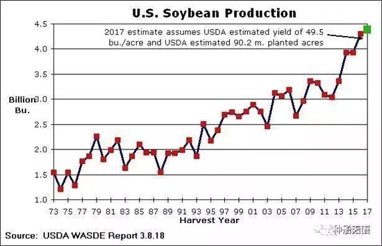 從上世紀70年代到現在,美國大豆的產量穩步上升。從1973年到2017年,美國大豆總產量增長了近2倍,和同期的中國的大豆產量形成鮮明對比。