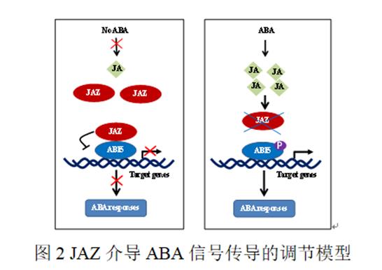之后的一系列實驗證明,小麥TaJAZ1可以直接與TaABI5相互作用,并且JAZ蛋白在擬南芥中負調節ABA反應,JAZ3和ABI5在體內的相互作用而抑制ABI5的轉錄激活活性。進一步以ABA響應的靶基因EM1(EARLY METHIONINE-LABELED 1)為研究對象,發現在正常條件下,JAZ3在EM1啟動子區域富集,而ABA處理6小時后這種富集消失,進一步說明JAZ3的作用受到ABA信號的調控。此外,該研究還發現ABA處理顯著上調JA生物合成基因(AOC2,ACX1,ACX2和KAT5)表達的,增加了依賴于ABI5功能的JA水平,從而導致JAZ蛋白的降解。總之,該研究揭示了JAZ對小麥種子萌發的調節作用及其與ABI5的作用模式,為JA和ABA信號互作調控小麥等作物種子萌發提供了證據,對進一步深入了解小麥等谷物種子萌發調控機制及穗發芽抗性育種具有重要參考價值。
