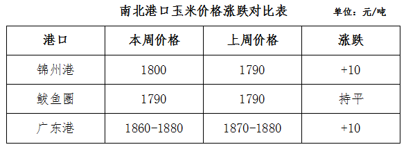 本周國內港口玉米價格穩中小幅上漲。由于國儲及地方儲備影響,東北產區大部分潮糧進入貿易環節,現貨價格受政策利好提振上行,但目前東北地區仍處于玉米售糧高峰期,北方港口集港量逐步增多,加上非洲豬瘟影響飼企效益下降,導致北糧南運貿易需求疲軟,港口走貨緩慢,庫存壓力增大,港口收購價格上漲動力不足;而南方港口庫存壓力高企,港口走貨速度加快,疊加北方玉米價格上漲,支撐貿易商報價心態偏強,但玉米現貨成交清淡,抑制港口收購價上行空間。