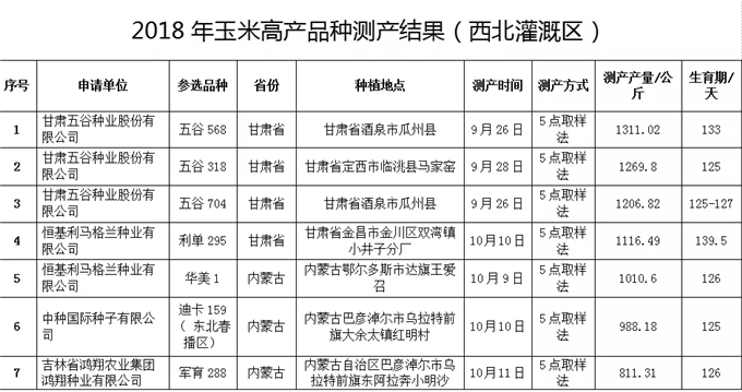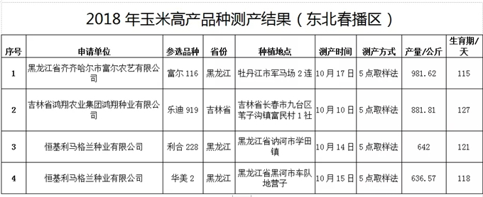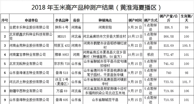 中國種子協會于2018年組織科研、教學單位和種子、推廣領域的專家120余名深入東北春播玉米區、黃淮海夏播玉米區和西北灌溉玉米區,分別對甘肅五谷種業股份有限公司的“五谷568”、合肥豐樂種業股份有限公司的“陜科6號”、黑龍江省齊齊哈爾市富爾農藝有限公司“富爾116”等20個品種進行實地測產驗收,得出各品種測產產量(具體見下表)。
