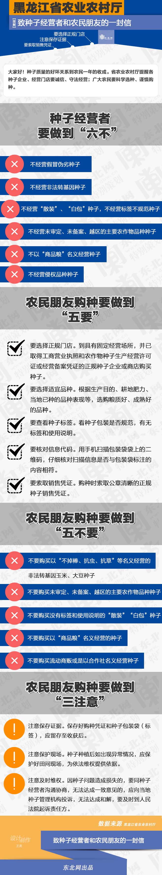 經營者和農民朋友的一封信》。通知明確了種子經營者要做到“六不”,農民朋友購種的注意事項及如何維權。