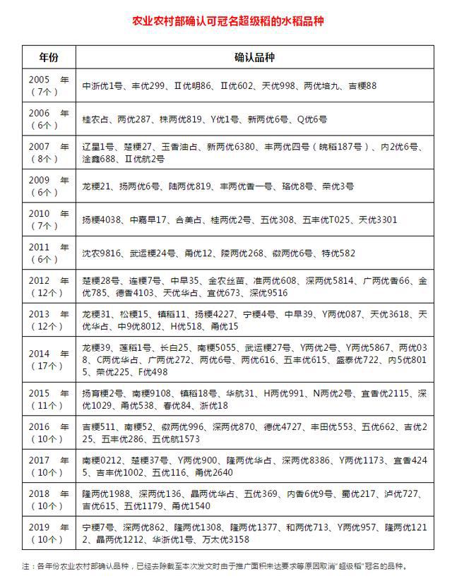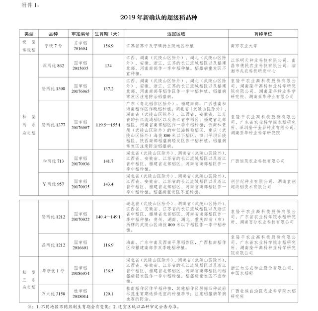 為規范超級稻品種認定和示范推廣,根據《超級稻品種確認辦法》(農辦科〔2008〕38號),經各地推薦和專家評審,現確認寧粳7號、深兩優862等10個品種為2019年超級稻品種(見附件1)。同時,取消推廣面積未達要求的國稻1號、金優299、II優084、II優7954、準兩優527、甬優6號、天優122、金優527、D優202等9個品種的超級稻冠名。目前,經農業農村部確認、可冠名超級稻的水稻品種共132個(見附件2)。