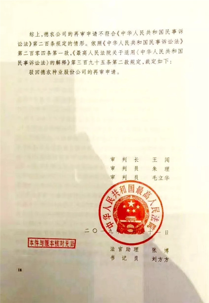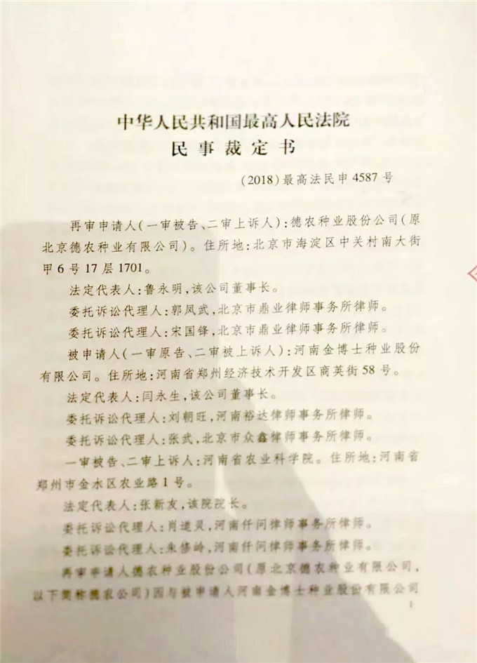 編者按:備受行業關注的鄭單58侵權一案,種業商務網曾以《【重磅】判了!河南高院對4950萬元植物新品種侵權案做出二審判決!》《【后續】萬向德農就子公司德農種業4950萬重大訴訟結果發布公告》《【重磅】侵權鄭58判賠4950萬一案有了新進展:德農種業申請再審,最高院已立案!》等為題,持續關注著本案的最新進展。現如今,根據公開資料顯示德農種業股份有限公司(原北京德農種業有限公司)與河南金博士種業股份有限公司侵害植物新品種權糾紛案,最高法民事裁定書“(2018)最高法民申4587號”公布,再審不符合《中華人民共和國民事訴訟法》第二百條規定的情形。依照《中華人民共和國民事訴訟法》第二百零四條第一款,《最高人民法院關于適用<中華人民共和國民事訴訟法>的解釋》第三百九十五條第二款規定,裁定如下:駁回德農種業股份公司的再審申請!