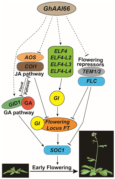 開花是決定植物營養生長和生殖生長轉變的重要過程,挖掘控制棉花開花時間的功能基因對于了解棉花開花調控機制具有重要的意義。研究人員從陸地棉中鑒定到一個含有AAI保守結構域的基因GhAAI66,組織表達模式分析發現該基因在陸地棉花器官中優勢表達。將GhAAI66基因沉默后發現花期延遲,而將GhAAI66基因在擬南芥中過量表達后,轉基因株系開花時間明顯比野生型提前,這表明GhAAI66參與開花時間的調控過程。為進一步探究該基因調控開花的分子機制,對GhAAI66轉基因植株進行了轉錄組分析,發現GhAAI66的表達抑制了茉莉酸的合成和春化途徑相關FLC基因的表達,上調了赤霉素信號轉導和光周期途徑相關ELF4基因的表達,最終激活下游的FT和SOC,從而促進開花時間的提前。該研究為解析棉花開花機制和棉花品種的遺傳改良打下了基礎。