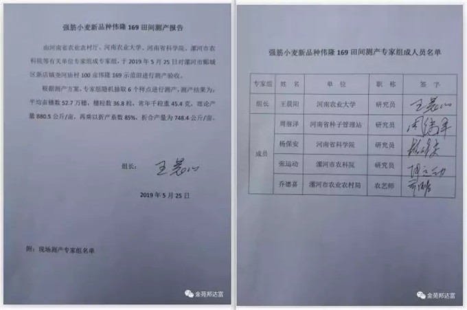 5月25日,由河南省農業農村廳、河南農業大學、河南省科學院、漯河市農科院等有關單位專家組成專家組,對漯河市郾城區新店鎮堯河廟村100畝偉隆169示范田進行測產驗收,現場實測畝產達748.4公斤!